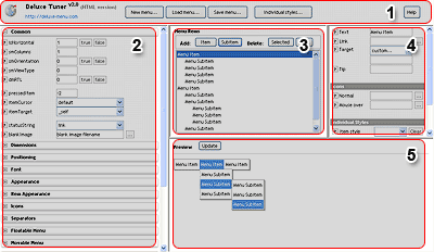 HTML version of DHTML Tuner is a frame-based HTML page. You can run Tuner in your web browser.Main window of horizontal menu bar has the following areas (click to see more info): 1. Toolbar 2. Menu parameters 3. Menu items 4. Item parameters 5. Real-time preview Horizontal Menu Bar - Main Window | DHTML Menu Freeware - Loading Dialog | HTML Menu Generator - Saving Dialog Javascript Menu Maker - Individual Styles Dialog Copyright (c) 2007, by DHTML-Menu.com | Contact Us All rights reserved. |