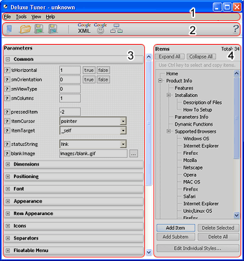 Each menu type has personal parameters. This section allows you to adjust menu parameters. To see more info about the parameter click on You can modify some parameters by entering values into a value field (for example, an integer value), others can be changed by using special dialogs (for example, a color or an image). You should modify parameters cautiously if you change them. For example, an integer parameter can only use numerical values and can't use text and special characters. If you get an error in a preview window after the modification - check the changed value. You can copy, cut-and-paste parameters' values. In other words, you can do the same actions as with standard HTML forms. 4. Menu Items These controls allow you to create, modify and delete menu items using Pop Up Menu Creator. The bottom items panel contains the following buttons: